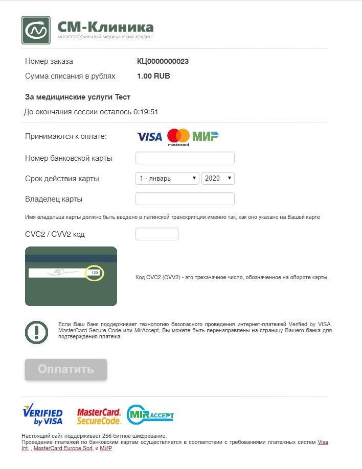 3. У вас откроется страница для реализации платежа, где необходимо заполнить все поля платежной карты: