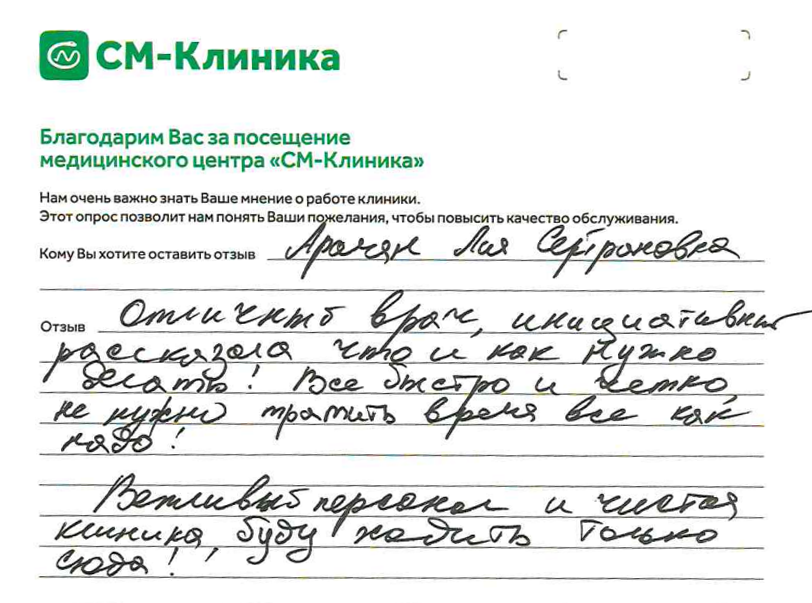 Спасибо Вам за добрые слова! Мы всегда стараемся предоставлять нашим пациентам высокий уровень обслуживания и делать всё возможное для их комфорта и здоровья. Нам приятно слышать, что Вы остались довольны работой Лии Сейрановны. Ваше доверие и положительный отзыв являются для нас лучшей наградой.