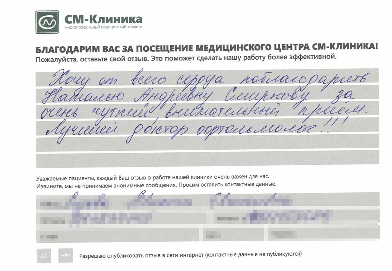 Смирнова Наталья Андреевна Я обратилась к ней, когда у меня резко и очень сильно стало падать зрение. Наталья Андреевна определила причину, назначила лечение. Следуя всем еë рекомендациям, зрение сразу же начало восстанавливаться, и, к концу лечения, восстановилось полностью, даже не потребовалось заказывать очки. Спасибо огромное, Наталья Андреевна!
