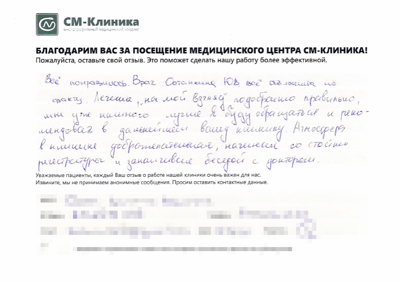 Меня зовут Антонина Костина, я руководитель службы сервиса СМ-Клиника в Санкт-Петербурге. На этой странице вы можете поделиться обратной связью о посещении медцентров нашего Холдинга. Расскажите, как прошел прием доктора, поделитесь впечатлениями о процедурах и обследованиях. Я и моя команда читаем все отзывы. Это помогает нам поддерживать качество лечения и сервиса на высоком уровне и работать над тем, чтобы пациенты были довольны. Если отзыв требует реакции со стороны клиники, мои коллеги свяжутся с вами в течение 1-2 дней.