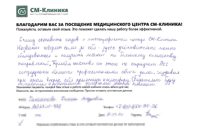 Меня зовут Антонина Костина, я руководитель службы сервиса СМ-Клиника в Санкт-Петербурге. На этой странице вы можете поделиться обратной связью о посещении медцентров нашего Холдинга. Расскажите, как прошел прием доктора, поделитесь впечатлениями о процедурах и обследованиях. Я и моя команда читаем все отзывы. Это помогает нам поддерживать качество лечения и сервиса на высоком уровне и работать над тем, чтобы пациенты были довольны. Если отзыв требует реакции со стороны клиники, мои коллеги свяжутся с вами в течение 1-2 дней.