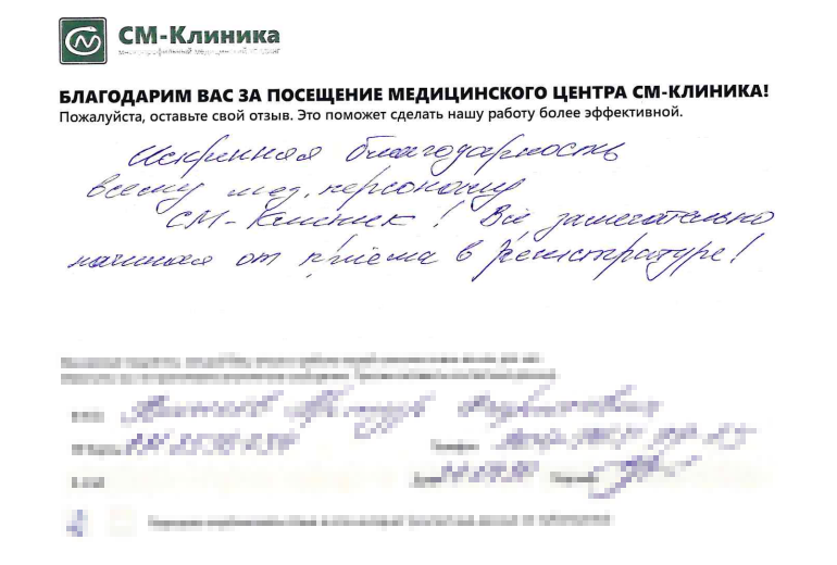 Меня зовут Антонина Костина, я руководитель службы сервиса СМ-Клиника в Санкт-Петербурге. На этой странице вы можете поделиться обратной связью о посещении медцентров нашего Холдинга. Расскажите, как прошел прием доктора, поделитесь впечатлениями о процедурах и обследованиях. Я и моя команда читаем все отзывы. Это помогает нам поддерживать качество лечения и сервиса на высоком уровне и работать над тем, чтобы пациенты были довольны. Если отзыв требует реакции со стороны клиники, мои коллеги свяжутся с вами в течение 1-2 дней.