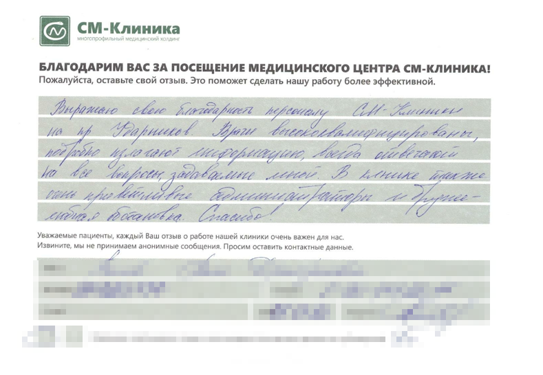 Меня зовут Антонина Костина, я руководитель службы сервиса СМ-Клиника в Санкт-Петербурге. На этой странице вы можете поделиться обратной связью о посещении медцентров нашего Холдинга. Расскажите, как прошел прием доктора, поделитесь впечатлениями о процедурах и обследованиях. Я и моя команда читаем все отзывы. Это помогает нам поддерживать качество лечения и сервиса на высоком уровне и работать над тем, чтобы пациенты были довольны. Если отзыв требует реакции со стороны клиники, мои коллеги свяжутся с вами в течение 1-2 дней.