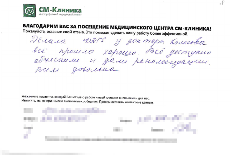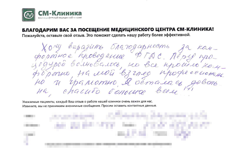 Меня зовут Антонина Костина, я руководитель службы сервиса СМ-Клиника в Санкт-Петербурге. На этой странице вы можете поделиться обратной связью о посещении медцентров нашего Холдинга. Расскажите, как прошел прием доктора, поделитесь впечатлениями о процедурах и обследованиях. Я и моя команда читаем все отзывы. Это помогает нам поддерживать качество лечения и сервиса на высоком уровне и работать над тем, чтобы пациенты были довольны. Если отзыв требует реакции со стороны клиники, мои коллеги свяжутся с вами в течение 1-2 дней.