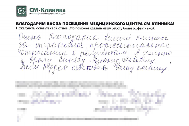 Меня зовут Антонина Костина, я руководитель службы сервиса СМ-Клиника в Санкт-Петербурге. На этой странице вы можете поделиться обратной связью о посещении медцентров нашего Холдинга. Расскажите, как прошел прием доктора, поделитесь впечатлениями о процедурах и обследованиях. Я и моя команда читаем все отзывы. Это помогает нам поддерживать качество лечения и сервиса на высоком уровне и работать над тем, чтобы пациенты были довольны. Если отзыв требует реакции со стороны клиники, мои коллеги свяжутся с вами в течение 1-2 дней.
