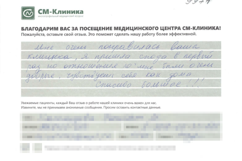 Меня зовут Антонина Костина, я руководитель службы сервиса СМ-Клиника в Санкт-Петербурге. На этой странице вы можете поделиться обратной связью о посещении медцентров нашего Холдинга. Расскажите, как прошел прием доктора, поделитесь впечатлениями о процедурах и обследованиях. Я и моя команда читаем все отзывы. Это помогает нам поддерживать качество лечения и сервиса на высоком уровне и работать над тем, чтобы пациенты были довольны. Если отзыв требует реакции со стороны клиники, мои коллеги свяжутся с вами в течение 1-2 дней.