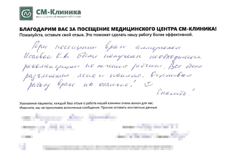 Меня зовут Антонина Костина, я руководитель службы сервиса СМ-Клиника в Санкт-Петербурге. На этой странице вы можете поделиться обратной связью о посещении медцентров нашего Холдинга. Расскажите, как прошел прием доктора, поделитесь впечатлениями о процедурах и обследованиях. Я и моя команда читаем все отзывы. Это помогает нам поддерживать качество лечения и сервиса на высоком уровне и работать над тем, чтобы пациенты были довольны. Если отзыв требует реакции со стороны клиники, мои коллеги свяжутся с вами в течение 1-2 дней.