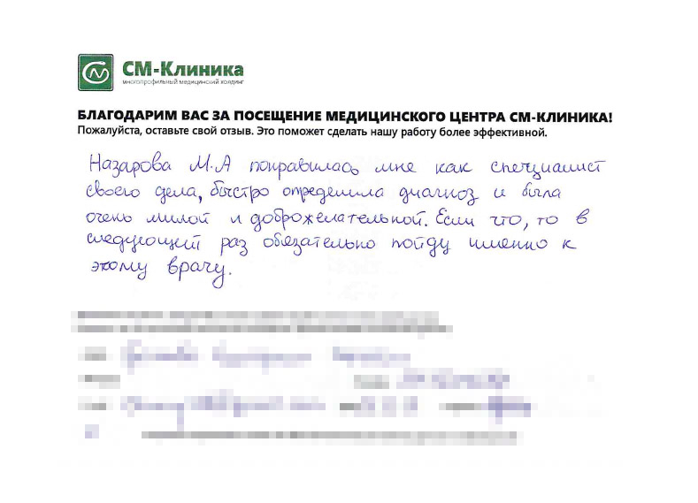 Меня зовут Антонина Костина, я руководитель службы сервиса СМ-Клиника в Санкт-Петербурге. На этой странице вы можете поделиться обратной связью о посещении медцентров нашего Холдинга. Расскажите, как прошел прием доктора, поделитесь впечатлениями о процедурах и обследованиях. Я и моя команда читаем все отзывы. Это помогает нам поддерживать качество лечения и сервиса на высоком уровне и работать над тем, чтобы пациенты были довольны. Если отзыв требует реакции со стороны клиники, мои коллеги свяжутся с вами в течение 1-2 дней.
