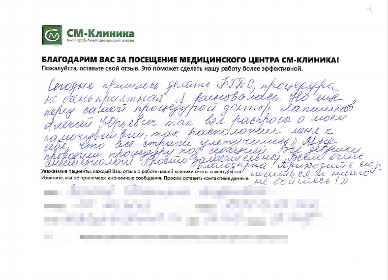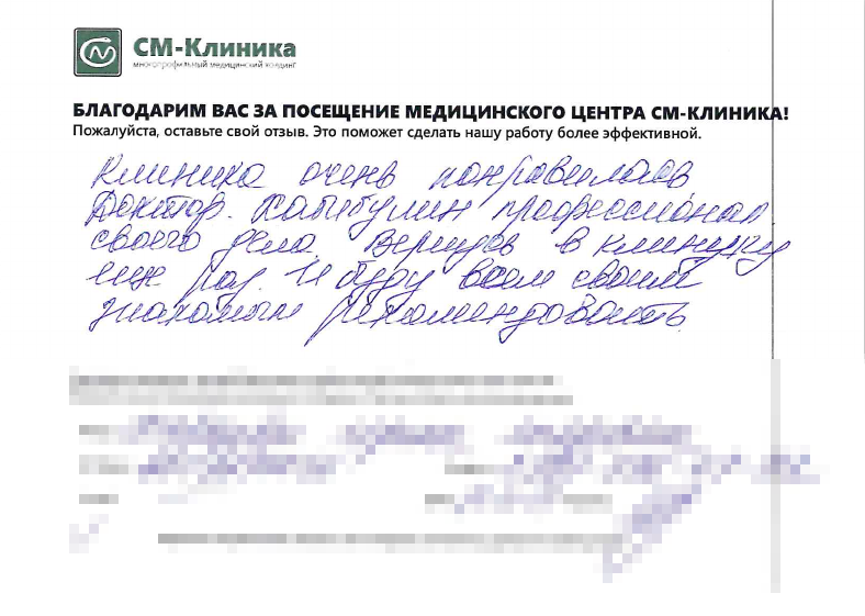 Меня зовут Антонина Костина, я руководитель службы сервиса СМ-Клиника в Санкт-Петербурге. На этой странице вы можете поделиться обратной связью о посещении медцентров нашего Холдинга. Расскажите, как прошел прием доктора, поделитесь впечатлениями о процедурах и обследованиях. Я и моя команда читаем все отзывы. Это помогает нам поддерживать качество лечения и сервиса на высоком уровне и работать над тем, чтобы пациенты были довольны. Если отзыв требует реакции со стороны клиники, мои коллеги свяжутся с вами в течение 1-2 дней.