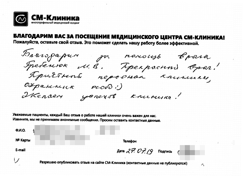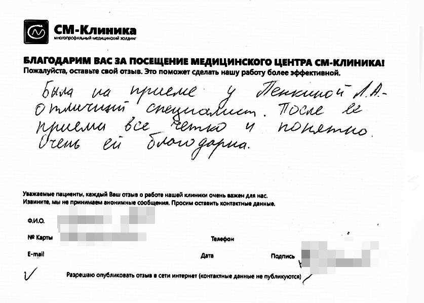Меня зовут Антонина Костина, я руководитель службы сервиса СМ-Клиника в Санкт-Петербурге. На этой странице вы можете поделиться обратной связью о посещении медцентров нашего Холдинга. Расскажите, как прошел прием доктора, поделитесь впечатлениями о процедурах и обследованиях. Я и моя команда читаем все отзывы. Это помогает нам поддерживать качество лечения и сервиса на высоком уровне и работать над тем, чтобы пациенты были довольны. Если отзыв требует реакции со стороны клиники, мои коллеги свяжутся с вами в течение 1-2 дней.