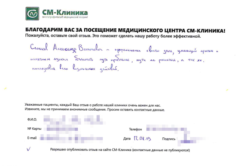 Меня зовут Антонина Костина, я руководитель службы сервиса СМ-Клиника в Санкт-Петербурге. На этой странице вы можете поделиться обратной связью о посещении медцентров нашего Холдинга. Расскажите, как прошел прием доктора, поделитесь впечатлениями о процедурах и обследованиях. Я и моя команда читаем все отзывы. Это помогает нам поддерживать качество лечения и сервиса на высоком уровне и работать над тем, чтобы пациенты были довольны. Если отзыв требует реакции со стороны клиники, мои коллеги свяжутся с вами в течение 1-2 дней.
