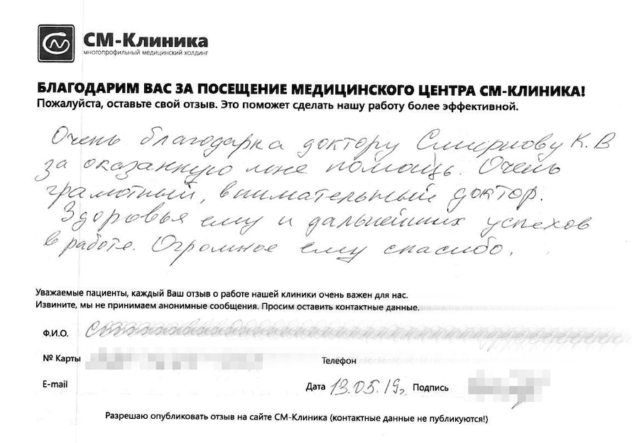 Меня зовут Антонина Костина, я руководитель службы сервиса СМ-Клиника в Санкт-Петербурге. На этой странице вы можете поделиться обратной связью о посещении медцентров нашего Холдинга. Расскажите, как прошел прием доктора, поделитесь впечатлениями о процедурах и обследованиях. Я и моя команда читаем все отзывы. Это помогает нам поддерживать качество лечения и сервиса на высоком уровне и работать над тем, чтобы пациенты были довольны. Если отзыв требует реакции со стороны клиники, мои коллеги свяжутся с вами в течение 1-2 дней.