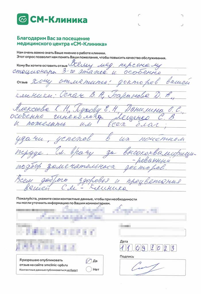 Меня зовут Антонина Костина, я руководитель службы сервиса СМ-Клиника в Санкт-Петербурге. На этой странице вы можете поделиться обратной связью о посещении медцентров нашего Холдинга. Расскажите, как прошел прием доктора, поделитесь впечатлениями о процедурах и обследованиях. Я и моя команда читаем все отзывы. Это помогает нам поддерживать качество лечения и сервиса на высоком уровне и работать над тем, чтобы пациенты были довольны. Если отзыв требует реакции со стороны клиники, мои коллеги свяжутся с вами в течение 1-2 дней.