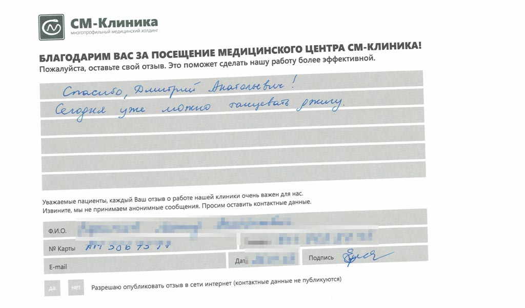 Меня зовут Антонина Костина, я руководитель службы сервиса СМ-Клиника в Санкт-Петербурге. На этой странице вы можете поделиться обратной связью о посещении медцентров нашего Холдинга. Расскажите, как прошел прием доктора, поделитесь впечатлениями о процедурах и обследованиях. Я и моя команда читаем все отзывы. Это помогает нам поддерживать качество лечения и сервиса на высоком уровне и работать над тем, чтобы пациенты были довольны. Если отзыв требует реакции со стороны клиники, мои коллеги свяжутся с вами в течение 1-2 дней.