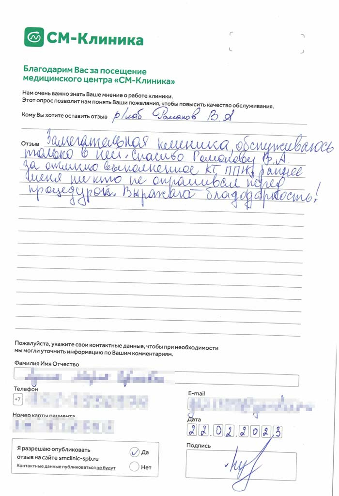 Меня зовут Антонина Костина, я руководитель службы сервиса СМ-Клиника в Санкт-Петербурге. На этой странице вы можете поделиться обратной связью о посещении медцентров нашего Холдинга. Расскажите, как прошел прием доктора, поделитесь впечатлениями о процедурах и обследованиях. Я и моя команда читаем все отзывы. Это помогает нам поддерживать качество лечения и сервиса на высоком уровне и работать над тем, чтобы пациенты были довольны. Если отзыв требует реакции со стороны клиники, мои коллеги свяжутся с вами в течение 1-2 дней.