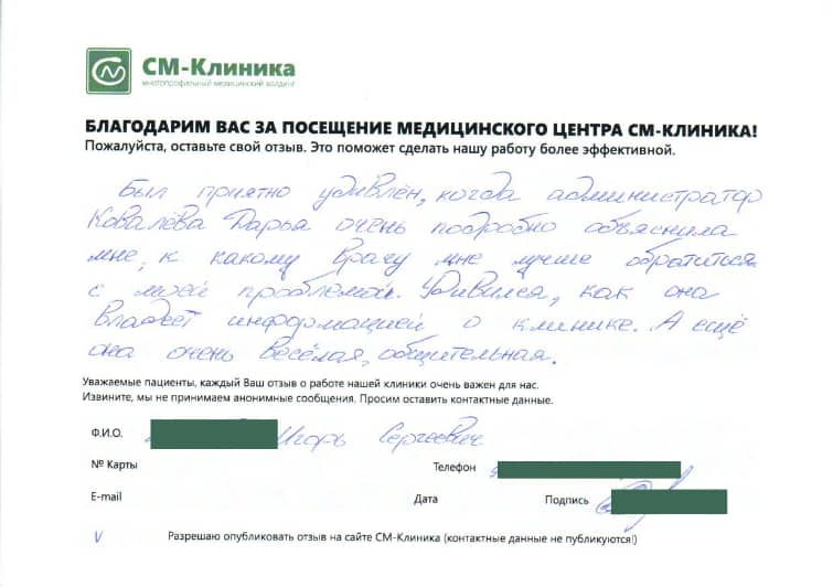 Меня зовут Антонина Костина, я руководитель службы сервиса СМ-Клиника в Санкт-Петербурге. На этой странице вы можете поделиться обратной связью о посещении медцентров нашего Холдинга. Расскажите, как прошел прием доктора, поделитесь впечатлениями о процедурах и обследованиях. Я и моя команда читаем все отзывы. Это помогает нам поддерживать качество лечения и сервиса на высоком уровне и работать над тем, чтобы пациенты были довольны. Если отзыв требует реакции со стороны клиники, мои коллеги свяжутся с вами в течение 1-2 дней.